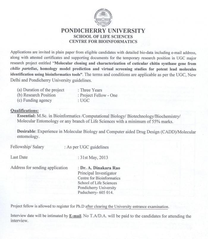 Advertisement: www.pondiuni.edu.in/news/recruitment-one-project-fellow-centre-bioinformatics