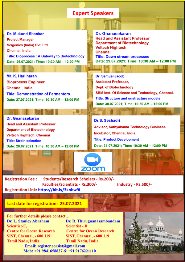 We are glad to inform you that we are organizing a SIX days Short Term Training Programme on BIOFERMENTATION with virtual demonstration, Expert's talk on UPSTREAM & DOWNSTREAM Processes, Kinetic Models and Product Development.